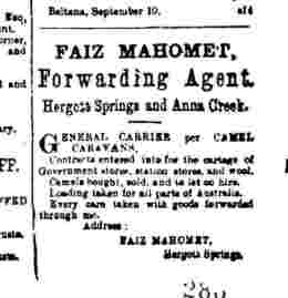 In early 1870 the Afghans went on strike and most left Beltana and moved to Blinman. In 1873 Mahomet Saleh, an Afghan cameleer, left Beltana for Western Australia with explorer P.E. Warburton. William Christie Gosse was assisted by three Afghans in his attempt to find a way from the Finke River to Perth. Two years later he assisted Ernest Giles on one of his expeditions. J.W. Lewis, surveying the country north east of Lake Eyre in 1874 and 1875 used camels. Later Thomas Elder's teams carried desperately needed supplies for the starving diggers at Milparinka. One early arrival was Haji Mulla Merban from Kandahar, Afghanistan. He came to Port Darwin and acted as leader among the Afghan camel drivers working for the Overland Telegraph Line. After a three year visit to India and Afghanistan he eventually settled in Adelaide. He married a European woman and acted as a peace maker between his countrymen, once settling a dispute between Abdul Wade and Gunny Khan, two wealthy camel owners. With the completion of the Adelaide Mosque in Gilbert Street in 1888 he also became the spiritual leader of the Afghan community in South Australia. He was buried at Coolgardie in 1897. Many of these Afghans did extremely well in their chosen business. Abdul Wade had four hundred camels and sixty men working for him. Fuzzly Ahmed worked the Port Augusta - Oodnadatta line for many years before moving to Broken Hill. Faiz Mahomet, who arrived at the age of 22, settled in Marree where he operated as a Fowarding Agent and General Carrier. In 1892 he moved to Western Australia and worked from the Coolgardie gold fields with his brother Tagh Mahomet.