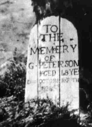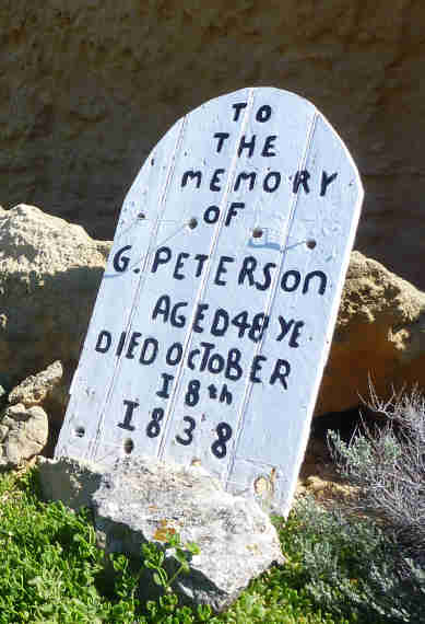 The first person to be buried on the island was G Peterson in 1838 a 48 year old whaler/sealer. His grave is special as it predates the formal death recording in South Australia. The photo was taken by A Searcy in 1907. Since 1879, newspaper reports refer to G Peterson as a whaler, probably from the nearby whaling station on Thistle Island. The grave is now 180 years old (2018).