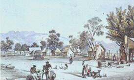 Early in 1842 nearly a hundred of this group of migrants were joined by other Lutherans, already living at Hahndorf, to establish the first village in the Barossa Valley on land the local Aborigines referred to as Taninda. About 2080 acres were leased, and later bought, from George Fife Angas to start their new venture, Bethany. The remaining members who had come on the Skjold founded Lobethal in the Adelaide Hills. While collecting statistical information in 1843, Daniel George Brock described Bethany, which had about two hundred inhabitants by that time, as being to the westward of the Barossa Range where a great quantity of land was roughly fenced, ploughed and sowed. Bethany is one of the townships occupied by Germans. The huts, he wrote, are of a miserable order and straggled over a long continuous space. The only one who could understand me was the schoolmaster. By 1844 the Bethany settlers, almost all of them of peasant stock, had nearly five hundred acres under cultivation, most of them with wheat. The town was laid out in the well known German style, variously called Reihendorf or Waldhufendorf, along the southern boundary of Angas' Special Surveys. They built their cottages along the village street on their farming land which went back as far as the Kedron, later Tanunda, Creek. Among some of the Skjold passengers to start Bethany were Ernst Gay, born in 1817 in Posen. His wife had died on board and he later remarried to Rosina Hohnberg, daughter of his neighbour George Hohnberg. Daniel Heppner, born in 1808 in Kreis Grunberg, also settled with his wife Louise Hohnberg, and young family in Bethany before eventually moving to New South Wales. Gottfried Nitschke, born in 1802 and his wife Eva Arlt settled and remained for the rest of their lives in the town. An early visiter wrote in 1843, I found a great quantity of land roughly fenced and the land ploughed and sewed between the trees. The wheat is very late and the huts are straggled over a long continuous space. The only one I could understand was the schoolmaster who was surrounded by about thirty lads and lasses. Many of the original settlers, for one reason or another, left the village within a few years to take up land in surrounding villages such as Rosenthal, Hoffnungsthal and Langmeil and were replaced by new arrivals from Germany. Life was hard and in the early years kangaroos, possums, wild herbs, roots, ducks, turkeys and other wild fowl provided a welcome addition to their staple diet. Their meals, though simple and frugal, seemed to have been wholesome and nourishing, the womenfolk being experts in cooking and domestic economy. For many years, the pattern of their daily life, such as customs, food, dress, houses and almost anything else followed strongly established traditions. Important occasions like births, baptisms, confirmations, marriages and deaths were carefully recorded in their big black family bibles. Until recently the communal organization of Bethany could still be traced in some of the fences which ran back in straight lines to the creek.