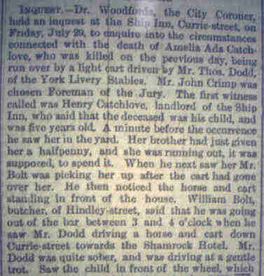 Edward Napoleon Buonaparte Catchlove, the first child of this second marriage, was born in Adelaide on 16 March 1842 and lived a long life. His brother Francis Henry, born in 1846 also had a long life. Annie Bertha lived long enough to get married at the age of 23 to Robert Henry Fiveash on 29 October 1873. Most of their other children died very young. Amelia Ada Augusta and Henry Charles both died at the age of five, William Harold only lasted sixteen months whereas Alfred Henry barely made it to twenty-one months. Harriett Louisa died on 6 April 1863, age fifteen months and Charles Henry who was born in 1853 just made seven months. The death of Amelia Ada was reported in the Adelaide Register of 30 July 1864.