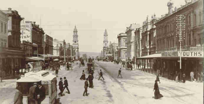 On the opposite side of Waymouth Street there was a paddock for unyoking bullocks and farther down King William Street a store, with a blacksmith's shop adjacent, and the land where the AMP Society's building once stood was then adorned by a stockyard.