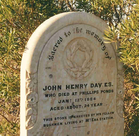 Above is the headstone of Davies' grave site at Phillips Pond. In an attempt to save as much space as possible and increase the speed of downloading, only part of the stone is displayed. Flinders Ranges Research has a full photograph of each of these, and many others as well.*** If you would like to find out more,