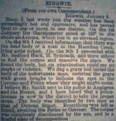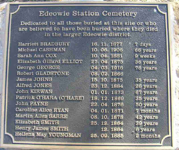 Prospects looked good in the Flinders Ranges at the start of the 1860s. Mining at Blinman, and several other northern mines, above average rainfall and high prices for copper and wool on the world markets, all pointed to good financial returns for everyone involved. Ore from Blinman was transported by bullock teams, first via Wilpena and Arkaba, but later via Brachina Gorge to Port Augusta. Naturally wherever the teamsters stopped for the night an eating house would be built to cash in on the passing travellers. One of these was built at Edeowie, some distance from the station homestead. With no railways as yet, the best the government of the day could do was to sink wells at these places and survey a small township at each of them. In February 1863 towns were surveyed at Yarrah, Mount Eyre, Hookina, Mern Merna, Parachilna, Kanyaka, Oratunga, Nuccaleena and Edeowie. The first of the twenty-three town blocks at Edeowie were offered for sale on 15 May 1863. Most of the blocks were sold to Adelaide residents. Four blocks were bought by Thomas Baker, a builder. One block went to John King Smith, a dealer and another block to Michael Kingborough, a merchant. All were Adelaide men eager to try their luck in the north. On 8 September 1863, lot 96 was sold to George Thompson a storekeeper from nearby Arkaba for $27.00. On 22 December 1863 Thomas Baker opened his hotel, and the store, owned by John King Smith and his wife, was also operating before the end of the year. Almost a year later, on 11 November 1864, lot 99 at Edeowie was sold to John Llewellyn Williams, blacksmith at Edeowie Station for $21.00. Not many blocks were sold after this date. Drought had set upon the land and pastoralists began to worry about the lack of rain and shortage of stock feed. This also affected the cartage of copper ore from the northern mines. With little or no feed available along the way teamsters were unwilling to risk their animals to transport supplies up north. This also meant that no copper was transported south to be sold. As the drought continued, the mines closed one after the other. One of the first victims of the drought was John McNeil from Mount James. While at Edeowie in September 1864, his thirsty dog, trying to reach the water in the well, fell in. John tried to save his dog but was unable to climb back out of the thirty metre deep well and drowned in the three metres of water at the bottom. It was a bad omen. Edeowie would see many more people die at the station or the little township during the next few years. On 16 November 1864, little Sarah Margaret Smith, the nearly two year old daughter of John King Smith, died followed a few days later by his six year old son, Henry James. Both died from dysentery. In January 1866, Pierce Larkins, a shepherd from Mount James, died from distress and want of water. On 30 January 1865 The Register carried this report
