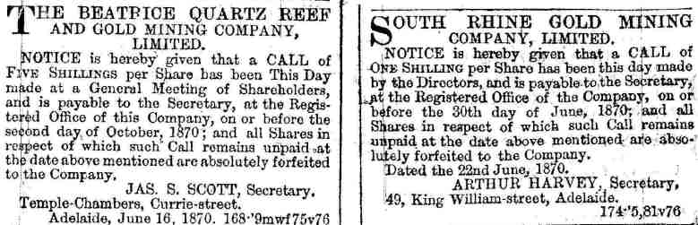 Frederick Hannaford had also staked out several promising claims near Blumberg, (todays Birdwood) named by Johann Gottlob after his small village in Prussia. To develop these claims Hannaford needed money and sold his interest to the Melbourne and Adelaide United Quartz Mining Company for 500 cash and 2,000 fully paid up shares of 2 each. The remaining 4,000 shares were to be sold to the general public.
