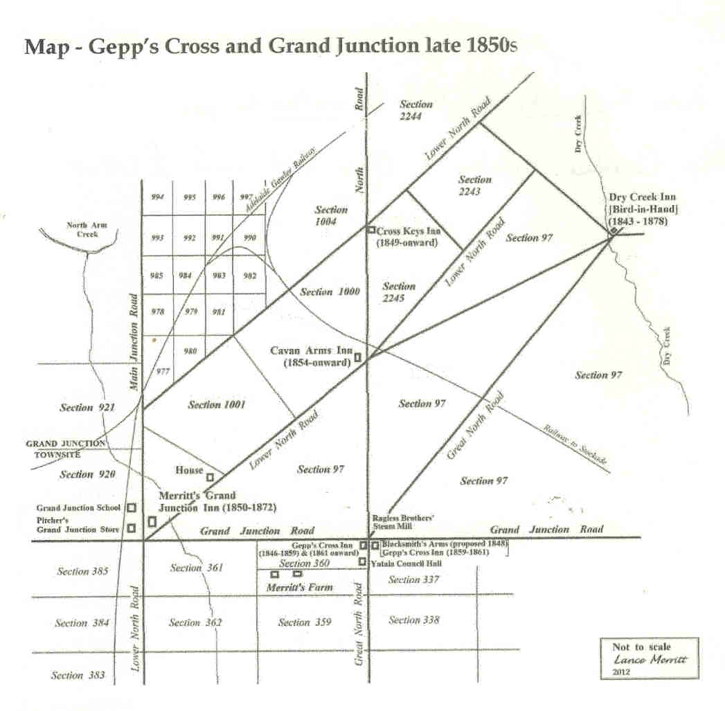 In 1867 Baillieres South Australian Gazetteer and Road Guide referred to Grand Junction as a postal township in the electoral district and Hundred of West Torrens, and under the control of the Yatala district council. It os situated on a flat called Para Plain, which is bounded on the East by gentle hills and on the West by a salt swamp. The name is given to the place in consequence of five roads meeting there. The district is an agricultural one and produces excellent crops of wheat and hay. The nearest places are Dry Creek or Montagu, distant 2 miles N.E. The means of communication therewith, as with Adelaide 6 miles south, being by Bowdens mail omnibuses along the great and lower North roads. There are two hotels, the Grand Junction and the Bird in Hand. The surrounding country is flat and the soil good. The population numbers about 100 persons. There was no entry for Gepps Cross.