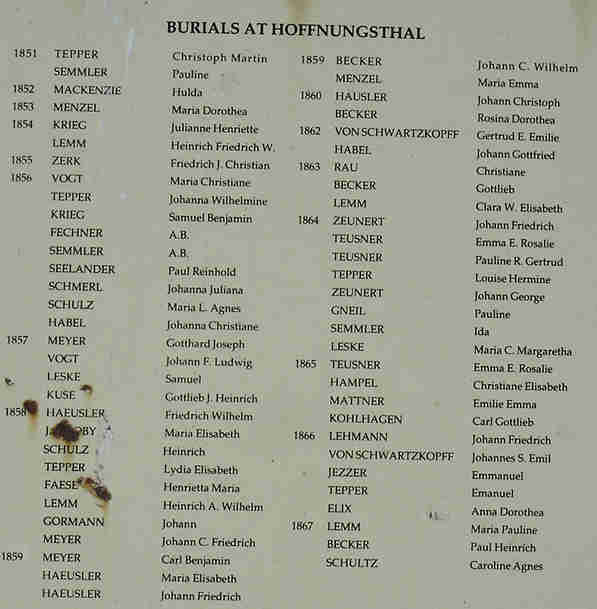 There are no Headstones at the Hoffnungsthal Burial Site. However, below is a list of those people buried there when the cemetery was in use.
