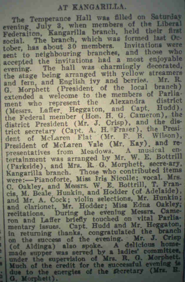 The name Kangarilla, in an area known as Eyre Flat, was first mentioned in a survey conducted in 1839. Although most people agree that the name is derived from an Aboriginal word there is no agreement on the actual meaning of it. As early as 1840 land was taken up by speculators and settlers. Among the last group was George Frederick Dashwood who had his sections allotted in England in 1840 before he left for South Australia. John Bottrill took up land in 1841 and added to his holdings in 1847 and 1849. John B. Thorngage also bought land in 1841 as did Thomas Golder in 1850 and Samuel Oakley in 1851. By 1844 many acres had been cleared and sown with wheat. Bottrill had 27 acres, Dashwood 20, Captain F.T. O'Halloran 91 acres and Samuel Oakley 26 acres. Twenty years later it was reported that 'The district is an agricultural one, and there are numerous vineyards in the neighbourhood producing fine crops of grapes'. A town was established in 1849 by John Bottrill and surveyed properly in the early 1860s. It was named Scaldwell but soon became Kangarilla. Many other name changes took place during these early years. The name of the Eyre Flat Post Office, opened in 1850 and operated by Charles Thorpe, changed to Kangarilla in 1862. A school which had been opened in 1859 as Eyre Flat closed in 1863. When reopened in 1870 it was also named Kangarilla. If all this was not confusing enough the town was split in two as well, one half under the control of the District Council of Kondoparinga and the other half controlled by the District Council of Clarendon. Regardless of these changes the name Eyre's Flat did not fade away in a hurry. By looking at the birth, marriage and death notices in the Register newspaper between 1860 and 1870 out of 26 notices 15 used Kangarilla and 11 Eyre's Flat. When John Paynter of Adelaide married Elizabeth Franklin in 1860, she was listed as living at Eyre's Flat, as was Samuel John Dailey when he married Mary Ann Battery of Cherry Gardens in 1861. On 31 August 1865 Mary Ann Elburn of Scott's Bottom, near Eyre's Flat died of bronchitis, aged 18 weeks. On 21 August 1866 the wife of Thomas Draper of Eyre's Flat had a daughter. Last, but not least Alpheus Biddle and Madonia Haines, both of Eyre's Flat were married in the Bible Christian Chapel at Eyre's Flat on 8 June 1867. Churches too were subject to name changes. The Wesleyan Chapel was built in 1855. Its first service was held on 16 December 1856, but within a year the building collapsed. When rebuild it became the Methodist Church. Due to population change and religious thinking it was once again rebuild, this time it became the Uniting Church. The foundation stone was laid in 1883. St Stephen's Anglican Church was opened on 31 May 1904. There was also the Bible Christian Church. The foundation stone for it was laid by Ann Bottrill in 1861. The land for the Chapel was donated by her husband John Bottrill. The Chapel opened for service on 16 February 1862. Both Ann and her husband are buried in the cemetery next to the Temperance Hall, not far from the site of the original chapel which has since been demolished. The Observer newspaper reported in 1926