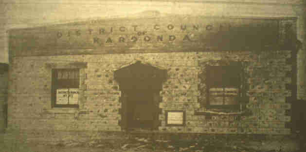 The only thing lacking was medical facilities. The nearest doctor at that time was in Murray Bridge or Tailem Bend. It was not until February 1925 that Dr P.S. Listch-Hussey commenced practice in Karoonda. A year later a cottage hospital was opened and finally in 1973 a brand new 14 bed hospital. By 1915 most of the businesses at the Karoonda more were relocated to the newly surveyed town. In October 1916 the town got its Telephone Exchange and five private phones were connected in 1917. In January 1917 a contract was signed for a new school building and separate teacher residence and was officially opened on 18 December. It served the local students for nearly ten years after which it was extended by another room in 1928. It was opened on 11 May by the Hon M. McIntosh, the Minister for Education, who granted a special half holiday for the students. The school remained like that until 1940 when enrolments had increased to 78. A School Band was started in August 1922, Wood work classes in 1924, a Welfare Club was formed in 1929 and an Old Scholars Association in 1933. Schooldays consisted of saluting the flag, inspection of hands, singing God save the King, assemblies, dipping girls pigtails in inkwells and the cane. A big first for the Karoonda School occurred in 1940 when it became the Karoonda Area School, the first in South Australia with 112 students and Keith Polkinghorn as first principal. Ten years later there were 230 students on the roll. It reached its highest number in 1968 with 377 students. The first Karoonda Show was held on 28 October 1920. The 1920s were prosperous years for the town and many new stone houses were built. It had now become a major railway town as well. In 1922 the District Council was formed and three years later Dudley Shepherd opened the first garage and ran a bus service to Adelaide until 1936 when he married and moved to Kangaroo Island. A Post Office was built and opened in June 1925. A Masonic Lodge was formed in 1925, through the efforts of J.A. Skinner and a Temple built in 1930. The RSL opened a branch in 1930 and a branch of the CWA in 1946.