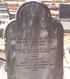When the Duke of York anchored at Nepean Bay, on 27 July 1836, the Beare family of six were among its migrants. Thomas Hudson Beare, born at Winchester England on 30 December 1792, his wife Lucy and children. Within hours of arrival, their daughter Lucy Beare gave birth to a girl. Sadly she died after only two days. When Lucy had another daughter a year later, the daughter survived but Lucy died. A plaque at the Myponga cemetery, commemorating his death, says Thomas Beare who died on 6 November 1861 at Aldinga. is buried at Myponga. However his death notice states that on the 7th November 1861, Thomas Hudson Beare died at his residence at Myponga, aged 68 vears. He was the brother of Mrs. Samuel Stephens. The deceased was the first storekeeper and general manager to the South Australian Company at Kangaroo Island. He was one of the pioneers of the colony, having landed at Kangaroo Island in the Duke of York in July, 1836, in company with his brother-in-law, Samuel Stephens, the first manager of the South Australian Company in Adelaide. Beare's wife Lucy, who died on 15 September 1887, was interred, as was Thomas, at the North Road Cemetery. The first settlement at Reeves Point lasted for nearly four years when it was abandoned by the South Australian Company in favour of Adelaide. However Kingscote survived, as did one of the Mulberry trees planted in 1836 in the Company's garden.