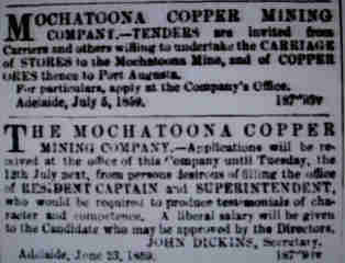 Eventually a very competent Captain was found, in the person of John Rowe, "a miner since eight years of age". In August 1859 Captain Rowe left Kapunda with a party of 13 ex-Burra miners who hoped "to find more remunerative employment there", even though the Mochatoona mine was more than five hundred kilometres north of the Burra mine. Both the Burra and the Moonta mines complained at times about a labour shortage, caused by miners leaving for the Northern Flinders Ranges.