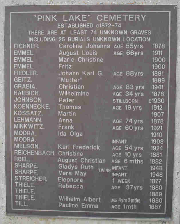 Below are SOME of the headstones of the Pink Lake Cemetery. In an attempt to save as much space as possible and increase the speed of downloading, only part of the stone is displayed. Flinders Ranges Research has a full photograph of each of these, and many others as well.
