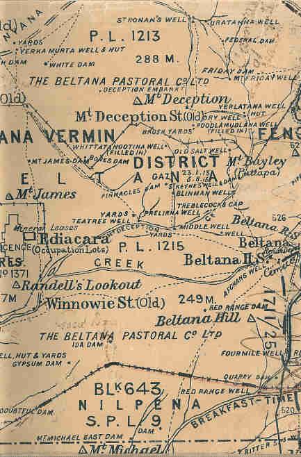 Most of the mining materials had finally arrived at the mine, after being held up because of heavy rains, which had resulted in the Winnowie Creek running a banker for two days and making the roads impassable for some more days. However the sixty or so millimetres of rain had replenished the well which supplied the miners with badly needed fresh drinking water. With prospects continually improving at the New Ediacara mine, the government had even sent Mr Irvine, Inspector of Roads, to the field to see how the road between the mine and Beltana could be improved and shortened. The need for this was made abundantly clear when a few days later Captain Truscott and his son, on their way back from Beltana to the mine, finished up in the Sundown Creek, and Mr P. Kaine, the mailman, was nearly washed away with his horse and the mail in another creek.