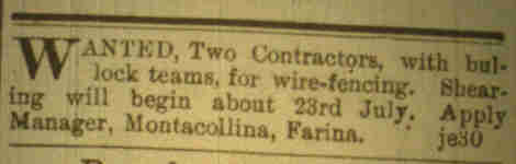 The Mount Freeling Police Station is at present the great rendezvous for teamsters, being the only place for a long distance both up and down the track where there is any feed, and it is becoming very scarce. The water at that place is good, but the supply is limited, but with a very small expenditure it might be very greatly increased. So far, the mail has been carried satisfactorily, but unless rain falls shortly the contractor will have a difficulty in keeping to time. Things have been very dull in this part. During the past two months it has at time threatened for rain, but only a few drops, and then cleared away. Rain is badly wanted now to keep the roads open for traffic. Feed is very scarce near all waterholes. The past year has been the driest in these parts for some time, although most of the old hands predict a general breaking up of the dry weather in January. Nothing is doing in stock passing now, and the road from here to Farina is now closed until we get rain'.